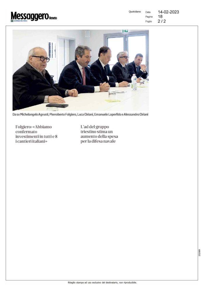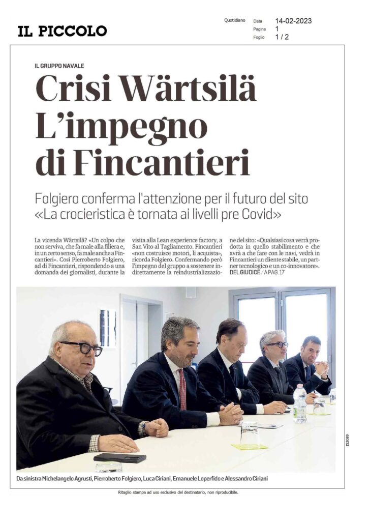 Lunedì 13 febbraio, Pierroberto Folgiero CEO Fincantieri S.p.A. ha visitato la nostra azienda digitale modello. Visita promossa da Michelangelo Agrusti, Presidente di Confindustria Alto Adriatico, alla quale hanno partecipato il ministro per i Rapporti con il Parlamento, Luca Ciriani, il parlamentare di FdI, Emanuele Loperfido e il sindaco di Pordenone, Alessandro Ciriani.