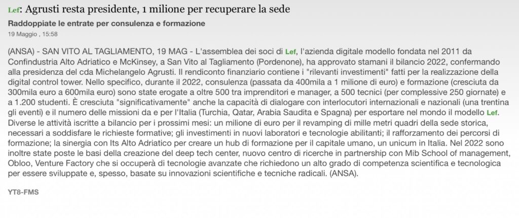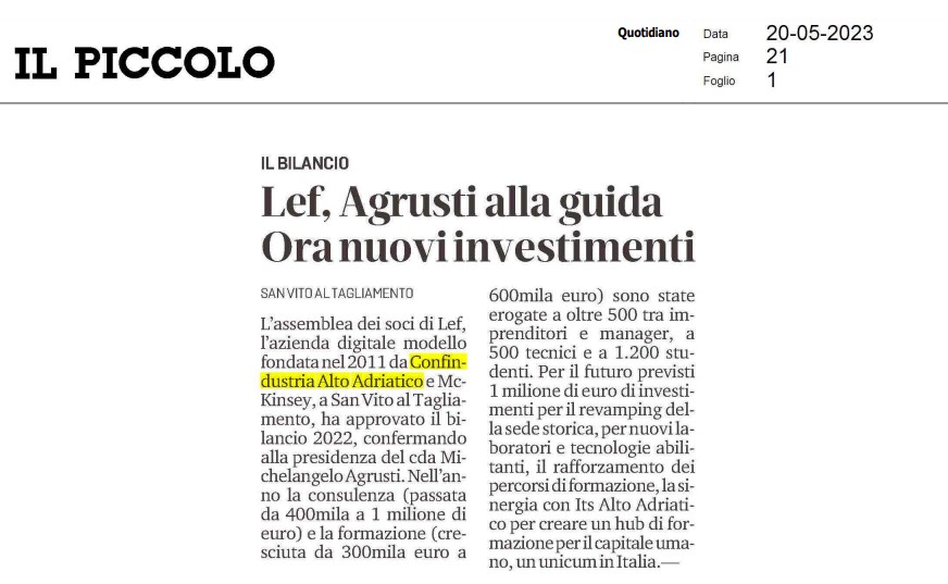 L’assemblea dei Soci di LEF, l’azienda digitale modello fondata nel 2011 da Confindustria Alto Adriatico e McKinsey & Company, ha approvato il bilancio 2022. Numeri che descrivono una storia di straordinaria progressione e lungimiranza, indicatori positivi che si innestano nelle previsioni che il Presidente, Michelangelo Agrusti, aveva formulato a cavallo dei due esercizi precedenti parlando di «passaggio intermedio di un percorso pluriennale fatto di investimenti in risorse umane e infrastrutture necessari per diventare riferimento nazionale e internazionale nella creazione di competenze, mentalità e comportamenti per creare manager e tecnici».