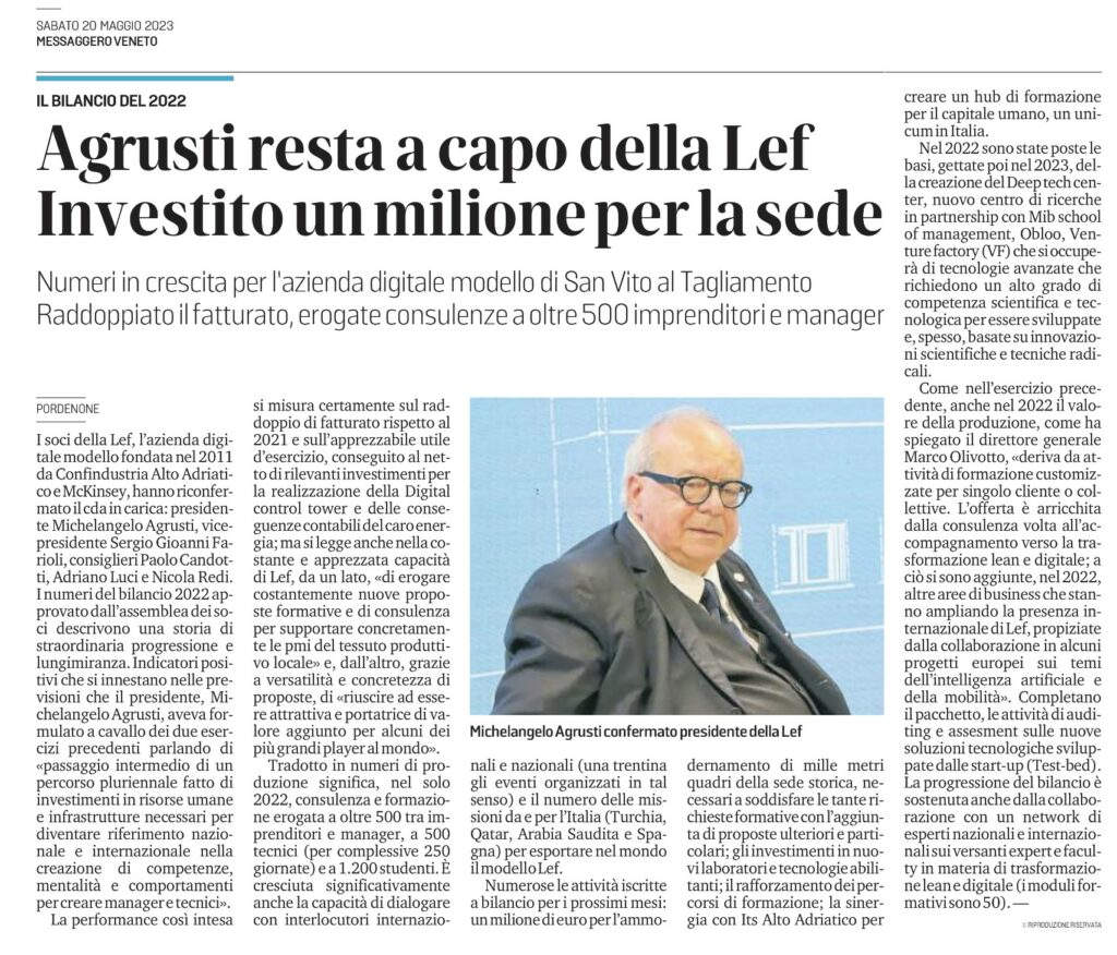 Messaggero Veneto “Agrusti resta a capo della LEF. Investito un milione per la sede” (in foto)